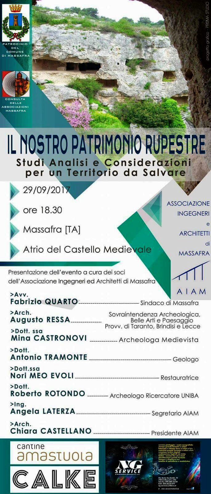 Venerdì 29 settembre 2017 alle ore 18:30, presso l'atrio del Castello Medievale di Massafra (TA), si terrà un incontro riguardante il patrimonio rupestre.