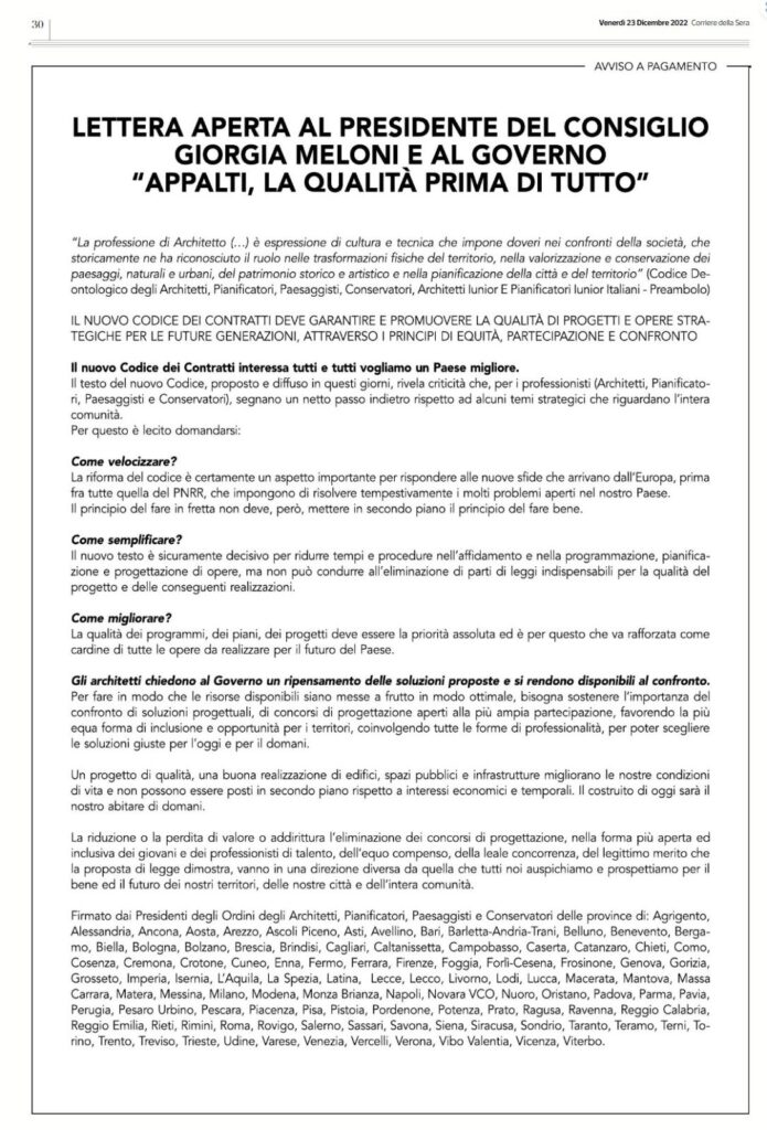 In allegato lettera aperta al Presidente del Consiglio Giorgia Meloni, pubblicata congiuntamente sul Corriere della Sera del 23 dicembre 2022, unitamente al comunicato stampa del Consiglio sempre sullo stesso argomento.
