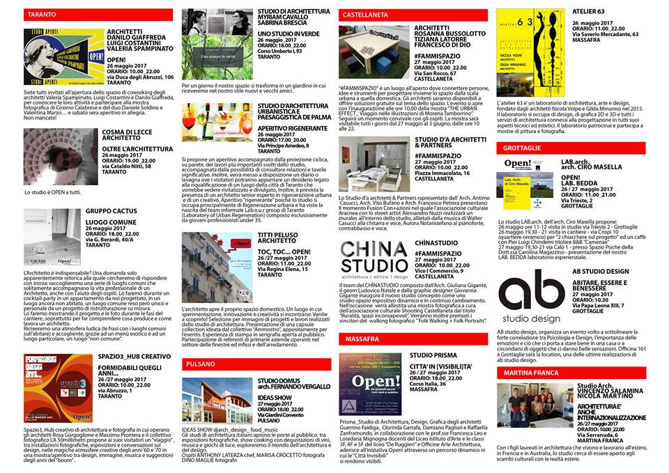 Per quanto riguarda l'Ordine degli Architetti P.P.C. della Provincia di Taranto sono 17 gli studi professionali che hanno aderito all’iniziativa e che per due giorni consecutivi apriranno i propri spazi di lavoro per presentare la loro attività ai visitatori i quali potranno scoprire da vicino gli ambiti e le modalità in cui operano.