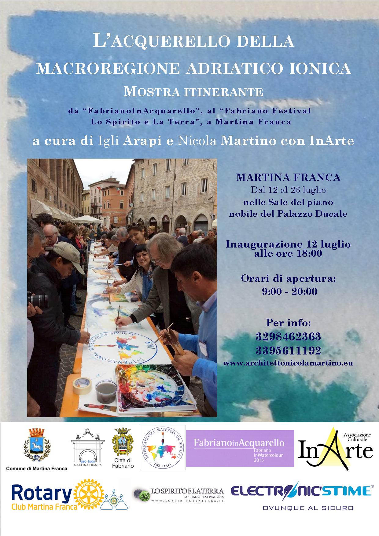 Dal 12 al 26 LUGLIO 2015, gli artisti Igli Arapi e Nicola Martino, dopo aver partecipato alla sesta edizione della convention internazionale “FrabrianoInAcquarello”, ospitano la mostra itinerante intitolata “L’acquerello della Macroregione Adriatico Ionica” presso la loro città di appartenenza, Martina Franca - Sale del piano nobile del Palazzo Ducale.