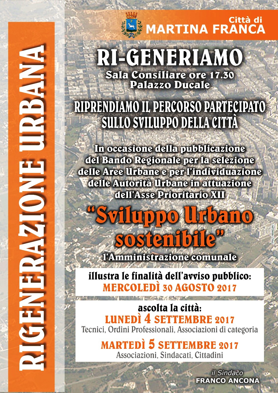 In occasione della pubblicazione del Bando Regionale per la selezione delle Aree Urbane e per l’individuazione delle Autorità Urbane in attuazione dell’Asse Prioritario XII “Sviluppo Urbano sostenibile”, il Comune di Martina Franca (TA) ha organizzato due forum tematici di partecipazione pubblica per ascoltare idee e proposte dei portatori di interesse, al fine di giungere ad un documento di sintesi da allegare alla Strategia di Sviluppo Urbano Sostenibile.