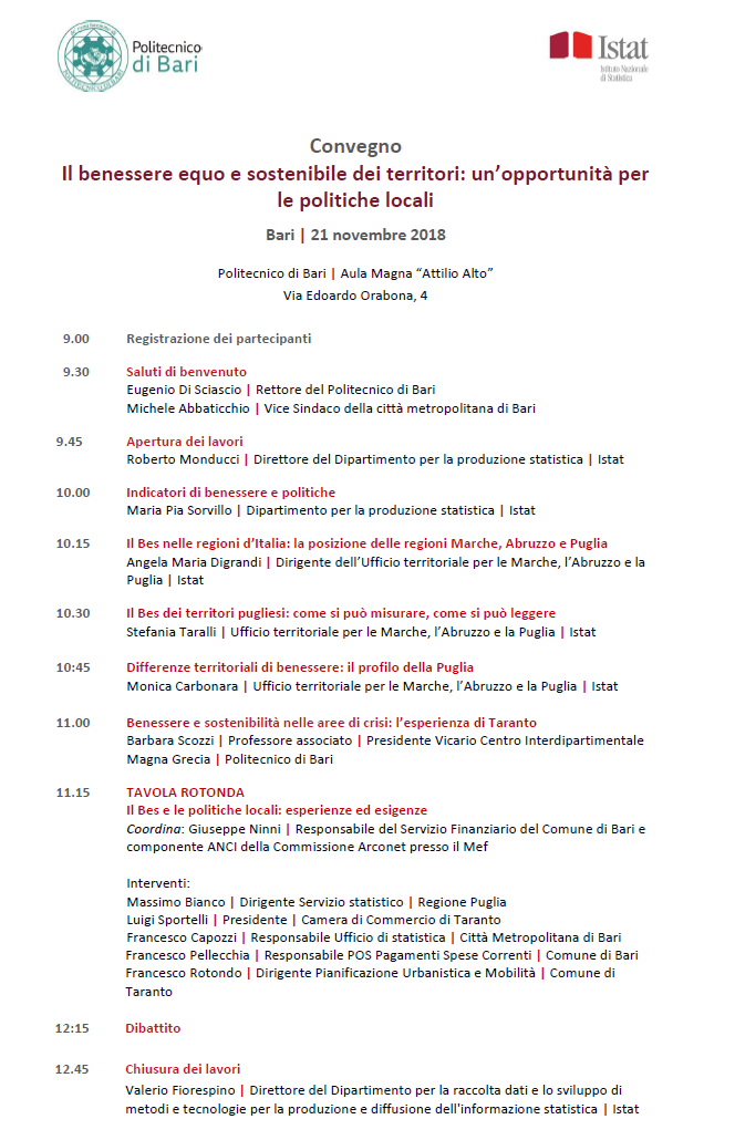 Istat - Istituto nazionale di Statistica e Politecnico di Bari organizzano, per la mattina del 21 novembre 2018, presso l'Aula Magna "Attilio Alto" del Politecnico di Bari l’evento “Il Benessere Equo e sostenibile dei territori: un'opportunità per le politiche locali”.