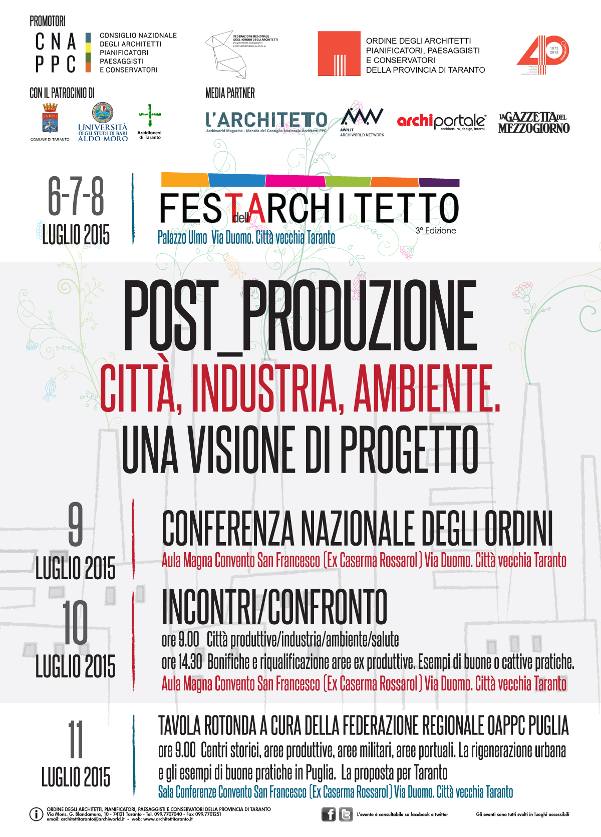 Nei giorni 9, 10 e 11 Luglio 2015 la nostra Città ospiterà per la prima volta la “Conferenza Nazionale degli Ordini degli Architetti Pianificatori, Paesaggisti e Conservatori” , l'Assemblea che vede insieme tutti i rappresentanti dei 105 Ordini degli Architetti PPC italiani e l'intero Consiglio Nazionale che avrà come tema: “Post_produzione. Città, industria, ambiente. Una visione di progetto”.