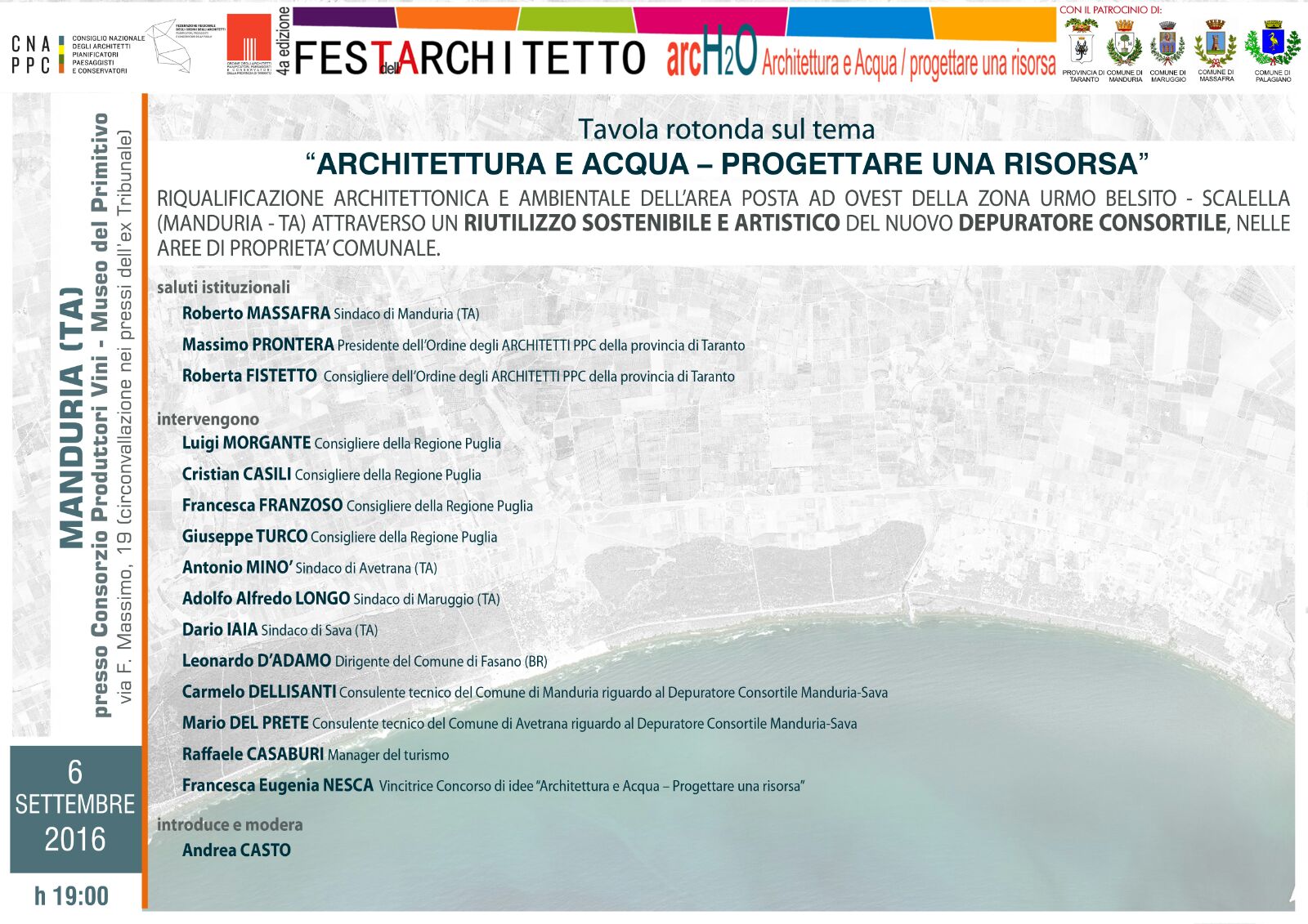 Nello scorso mese di agosto si è svolta la IV edizione della Festa dell’Architetto. L’importante manifestazione ha visto alternarsi diverse iniziative sia nella nostra Città che in Provincia. Purtroppo il maltempo ha interrotto alcuni degli eventi della terza tappa in programma il 6 e il 7 agosto a San Pietro in Bevagna (Marina di Manduria) e in particolare lo svolgimento della Tavola rotonda dal titolo “Architettura e acqua/progettare una risorsa – Riqualificazione architettonica e ambientale dell’area ad ovest della zona Urmo Belsito-Scalella (Manduria) attraverso un riutilizzo sostenibile e artistico del nuovo depuratore consortile, nelle aree di proprietà comunale”.