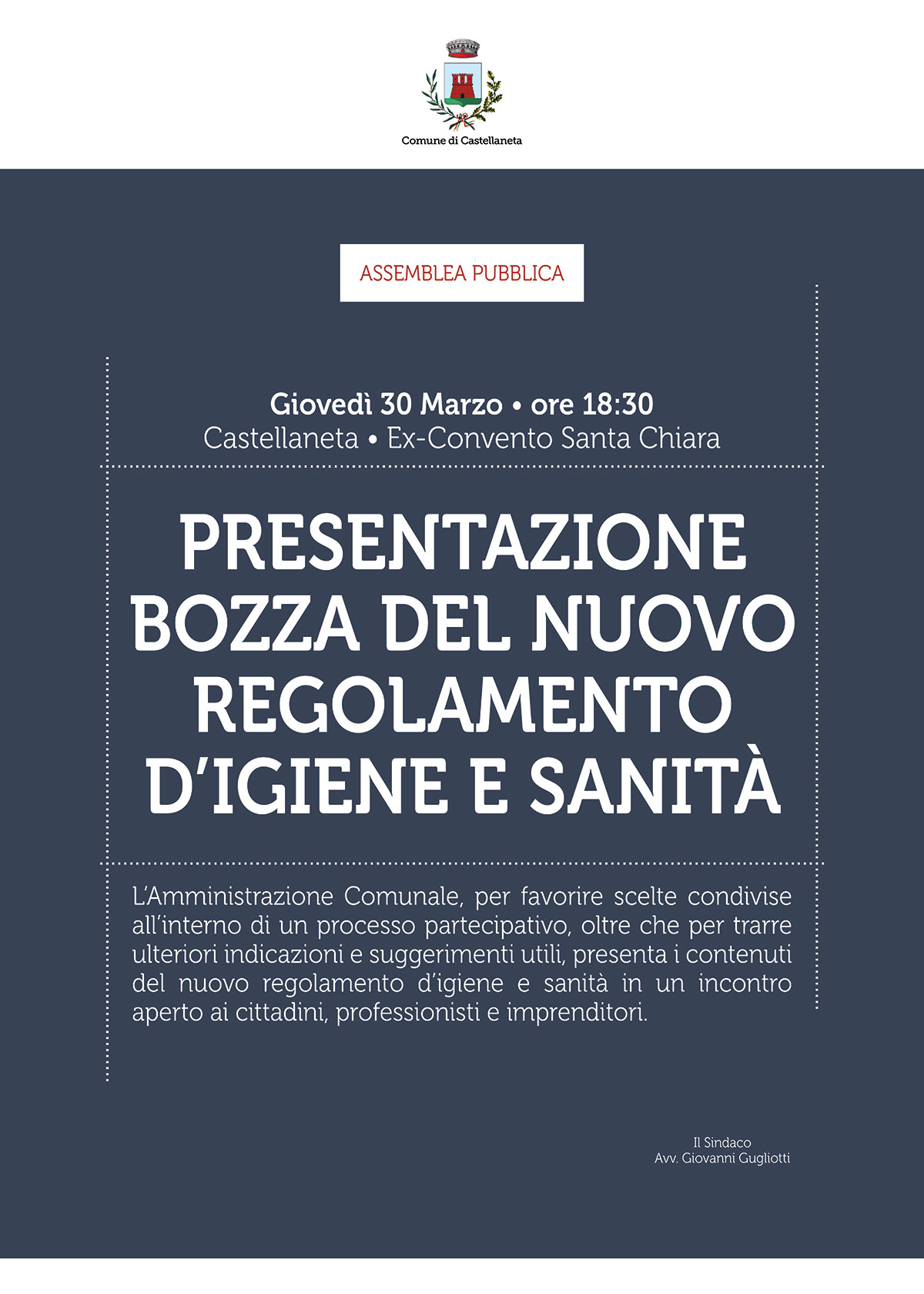Il Comune di Castellaneta (TA) ha avviato le procedure per l'approvazione del nuovo Regolamento di Igiene e Sanità che tenga conto delle specificità del territorio e della vocazione agricola e turistica dello stesso, la cui bozza, elaborata dal responsabile della competente U.O. SIAN occidentale Taranto della ASL TA, è disponibile per il download al seguente link: https://goo.gl/wVG2F9.
