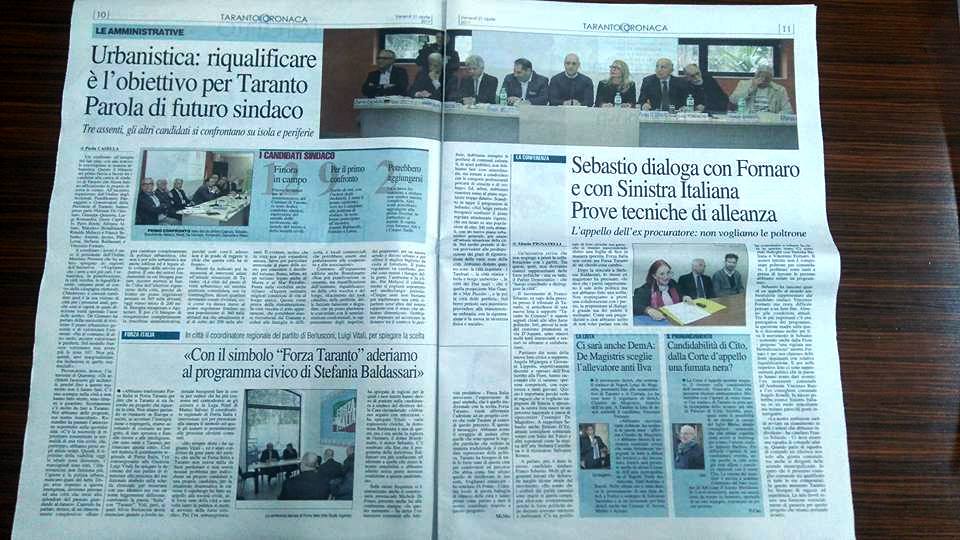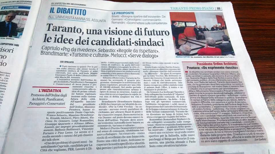 In vista delle prossime consultazioni amministrative della città di Taranto per l'elezione del nuovo Sindaco, l'Ordine degli Architetti P.P.C. della Provincia di Taranto ha organizzato per il prossimo Giovedì 20 aprile 2017 (a partire dalle ore 17:00 presso l'Aula Magna Giovanni Paolo II - Piazzetta Santa Rita) un incontro/confronto pubblico tra tutti i candidati alla carica di Sindaco di Taranto.