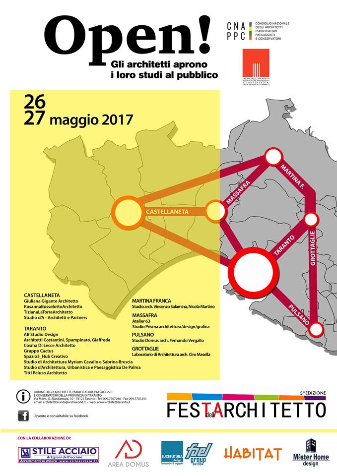 Per quanto riguarda l'Ordine degli Architetti P.P.C. della Provincia di Taranto sono 17 gli studi professionali che hanno aderito all’iniziativa e che per due giorni consecutivi apriranno i propri spazi di lavoro per presentare la loro attività ai visitatori i quali potranno scoprire da vicino gli ambiti e le modalità in cui operano.